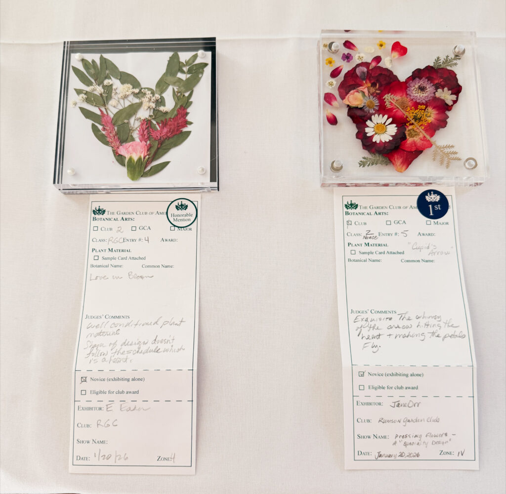 Class 1: Love in Bloom – Create a heart-shaped exhibit using flowers pressed between a frame of 2 sheets of plexiglass. Design will be staged flat on a 42” high table covered with a white tablecloth. Viewed and judged from above. (5) Entries