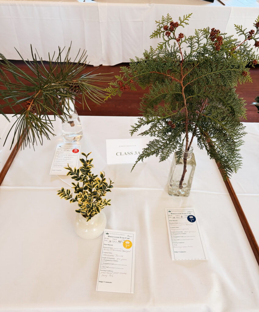 Class 3: One evergreen branch (with or without berries or cones) not to exceed 24” in length from lip of container to tip of branch. To be displayed in member’s own container. (*class was sub-divided)